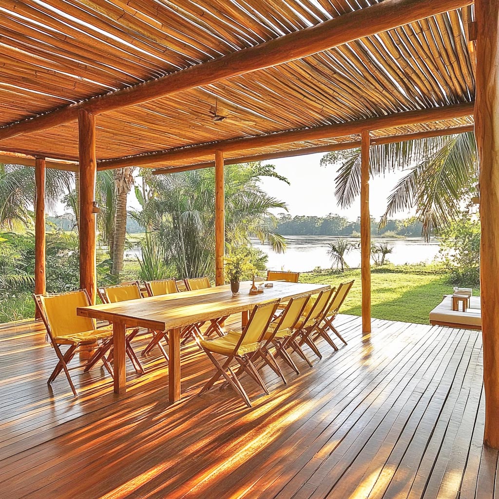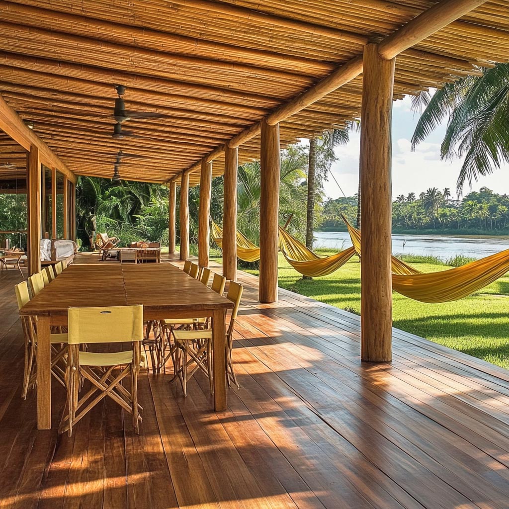 🏢 Empreendimentos Comerciais – Restaurantes, pousadas e espaços comerciais podem utilizar pergolados de eucalipto tratado para compor ambientes charmosos e aconchegantes.